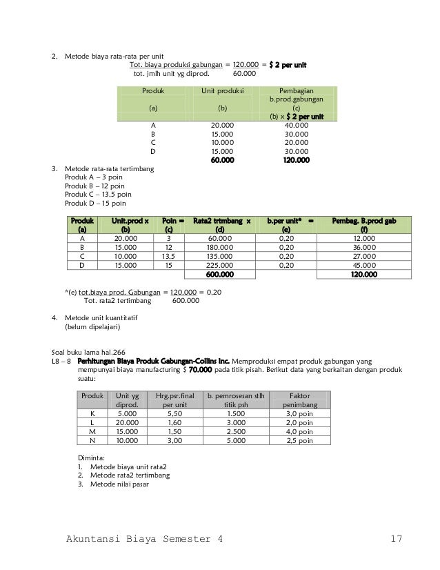 Sebelumnya 31.000 jumlah unit yang harus. Alokasi biaya bersamanya sebagai berikut : Pada umumnya metode ini digunakan oleh perusahaan yang menghasilkan beberapa macam produk yang sama dari satu proses bersama tapi mutunya berlainan. Ada dua cara untuk menghitung harga pokok per unit yaitu: Adalah suatu teknik peramalan mengasumsikan bahwa permintaan pasar tetap kecil sepanjang waktu. Contoh soal dan jawaban harga pokok proses. Tenaga kerja langsung dan ov. Rp 3.000 x 40 = rp 120.000. Setelah barang sampai ke perusahaan dan diperiksa ternyata ada 2 unit barang yang tidak sesuai pesanan. Berbagi ke twitter berbagi ke. Contoh soal akuntansi biaya metode rata rata tidak akan terlepas dari adanya laporan biaya produksi per departemen yang terlibat dalam proses pembuatan barang perusahaan. Agar unit ekuivalen tiap biaya produksi dapat dialokasikan dengan jelas maka anda perlu mengetahui total biaya yang dipergunakan. Produk sampingan memerlukan proses lebih lanjut agar mendapatkan nilai ekonomis yang tinggi.
